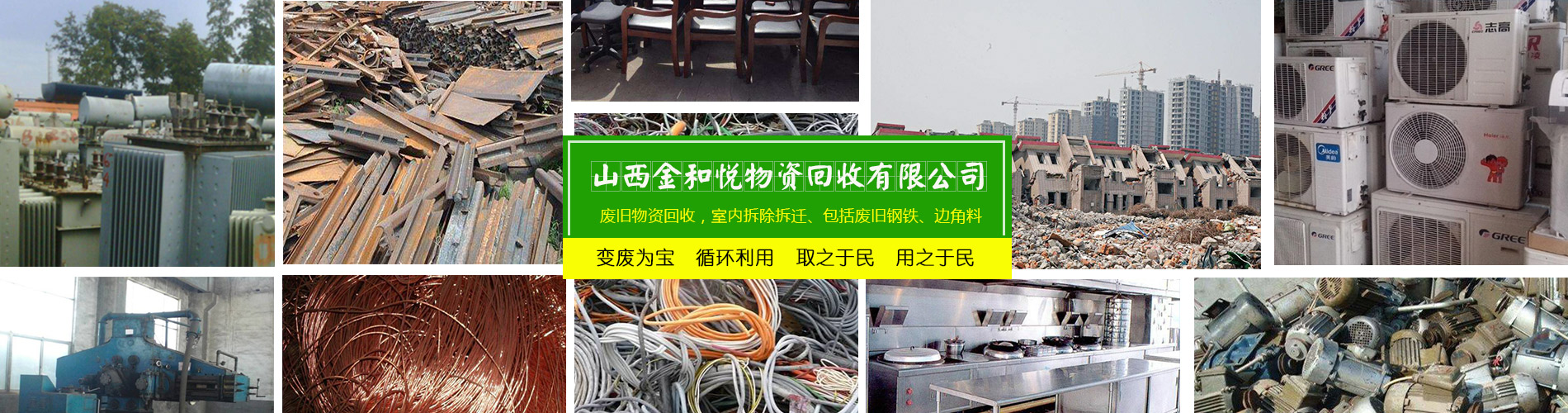 山西金和悅物資回收有限公司是一家從事廢舊物資回收,整廠設備打包回收的公司。主要可回收社會各行各業的廢舊物資,包括廢鋼廢鐵/廢銅廢鋁/稀有金屬/廢不銹鋼/廢舊機械設備/電線電纜/電池電瓶回收以及廢舊廠房整體設備打包回收。免費上門估價,現場付款,可帶工人上門,清理庫房。我公司立足于環保,利用閑置的資源,變廢為寶,循環利用,取之于民,用之于民,讓有效的資源得到合理的利用,充分體現它的價值。公司堅持“以質量求生存,以信譽求發展”的基本原則,為山西及周邊地區的企業、單位和個人提供安全、快捷的服務。歡迎各界有廢料或需要拆除的人士來電洽談業務!
